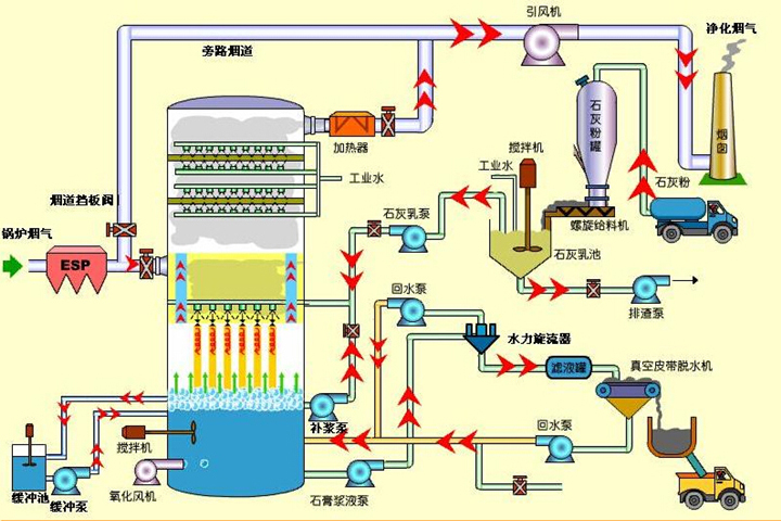 “石灰石-石膏”濕法脫硫工藝鍋爐引風(fēng)機(jī)排出的原煙氣由增壓風(fēng)機(jī)導(dǎo)入脫硫系統(tǒng),通過(guò)GGH(氣體加熱器)進(jìn)行熱交換后煙氣進(jìn)入吸收塔。鍋爐引風(fēng)機(jī)排出的原煙氣由增壓風(fēng)機(jī)導(dǎo)入脫硫系統(tǒng),通過(guò)GGH(氣體加熱器)進(jìn)行熱交換后煙氣進(jìn)入吸收塔。在吸收塔內(nèi),原煙氣自下而上通過(guò)塔身,遇噴淋系統(tǒng)噴出的霧狀石灰石漿液逆流混合,脫硫后的凈煙氣經(jīng)噴淋系統(tǒng)上部的除霧器除去煙氣所攜帶的霧滴后排除吸收塔進(jìn)入GGH,經(jīng)過(guò)GGH換熱升溫后經(jīng)煙囪排出。