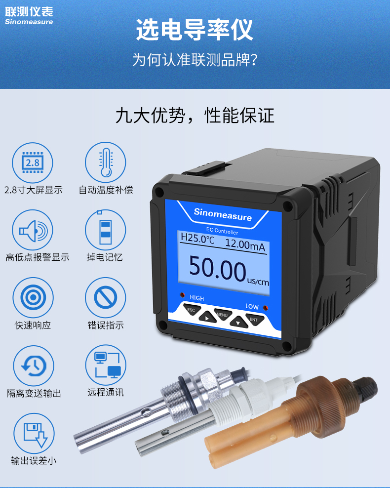 聯測儀表SIN-TDS210-C工業電導率儀表,廣泛應用于火電、化工化肥、冶金、環保、制藥、生 化、食品和自來水等行業。控制器主要對溶液中的電導率/總溶解固體/ 電阻率和溫度進行連續監測。