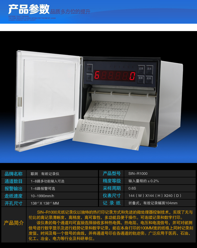 SIN-R1000有紙記錄儀打印記錄功能采用進口固定式熱敏頭,無筆墨消耗,無筆位誤差,抗震動。記錄儀為萬能信號輸入,能夠記錄溫度、溫濕度、電流、電壓、壓力、流量、液位等現場所有信號。